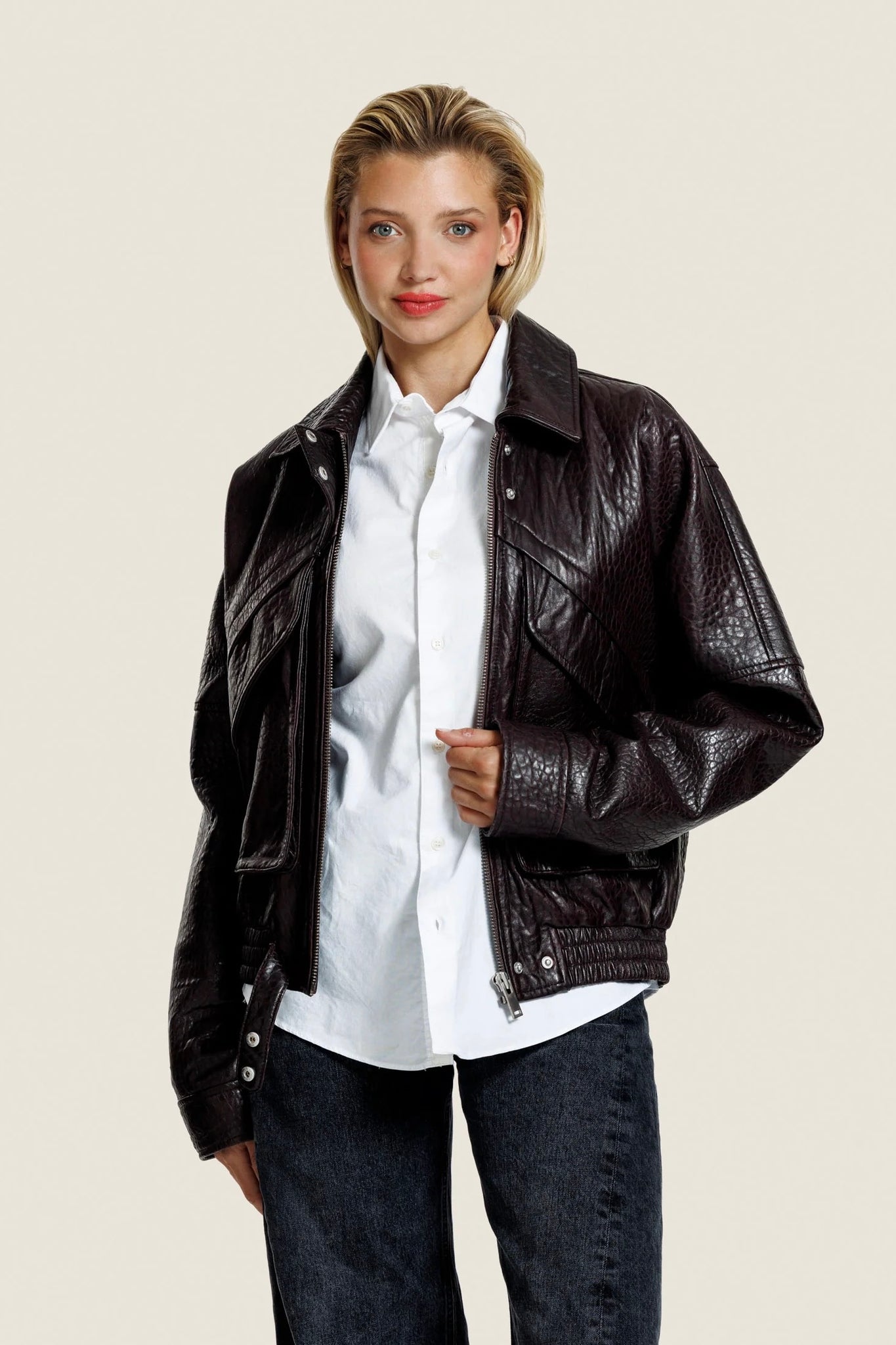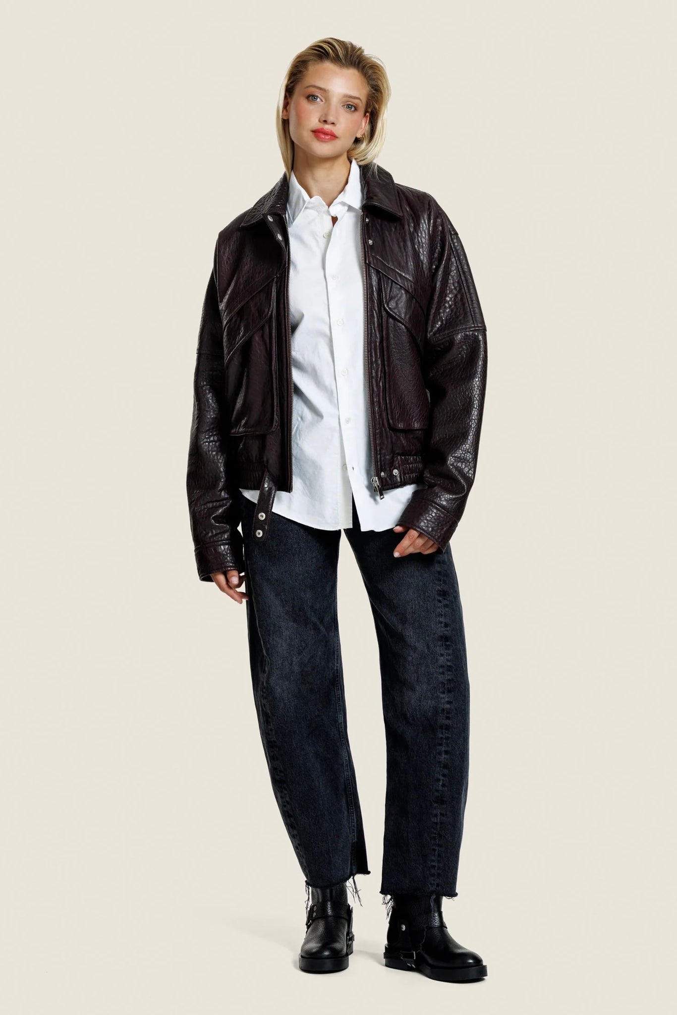 With its bold, structured design and statement panel detailing, this jacket brings a tough, modern edge to any outfit. The textured leather and architectural lines across the front and shoulders create a striking silhouette that sets it apart from the rest.