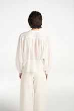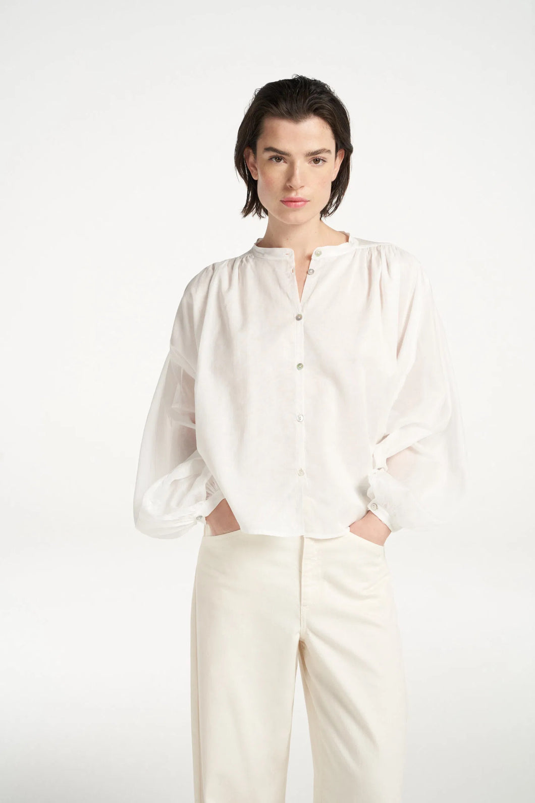 A cotton voile blouse with wide balloon sleeves, collarless and a button closure