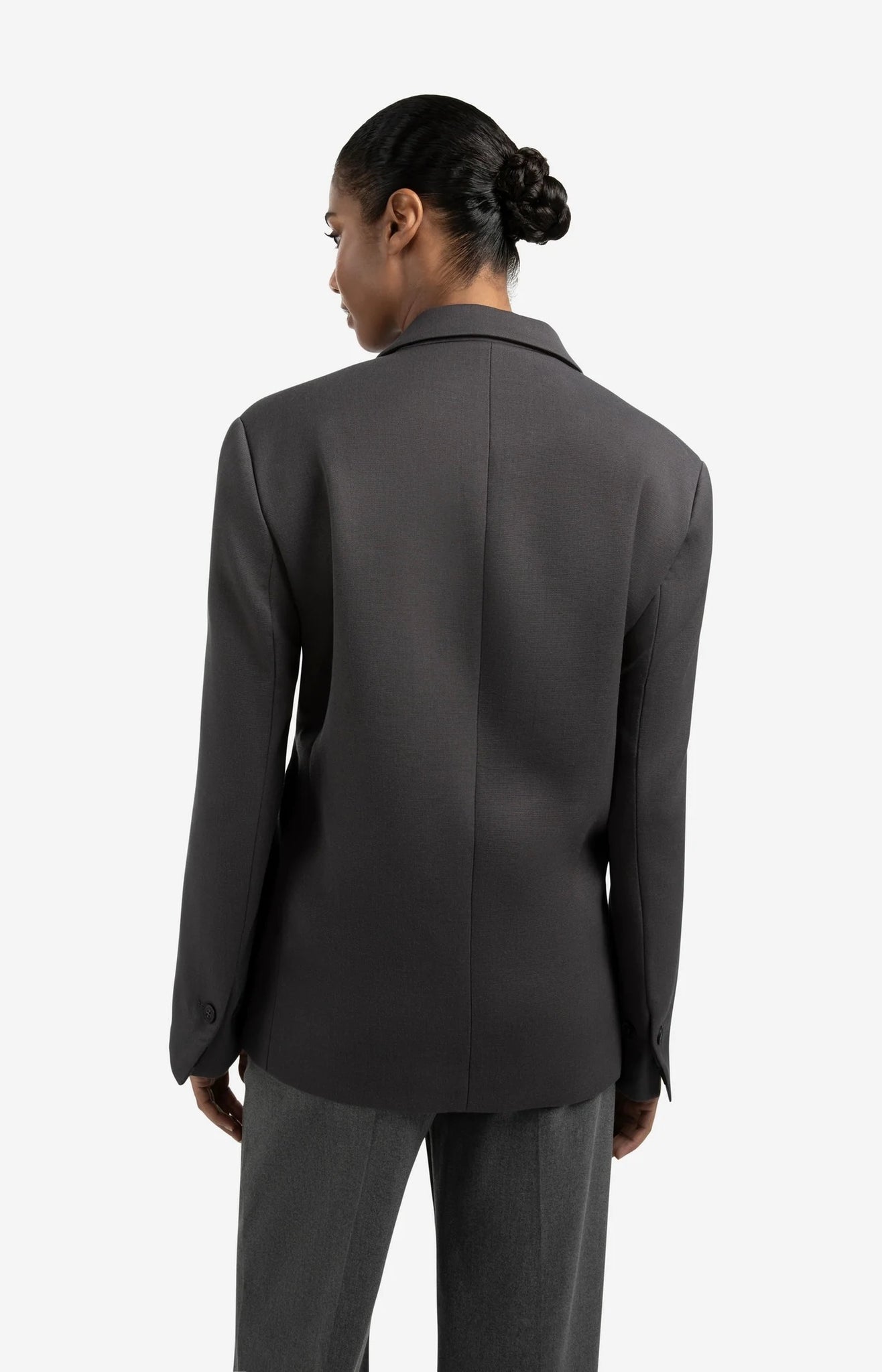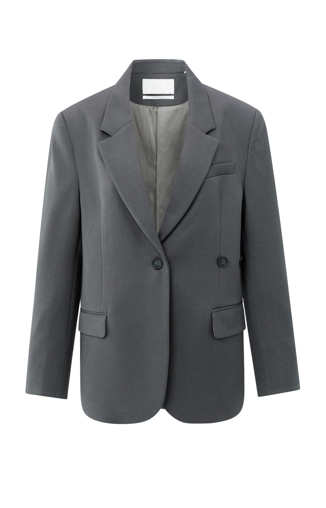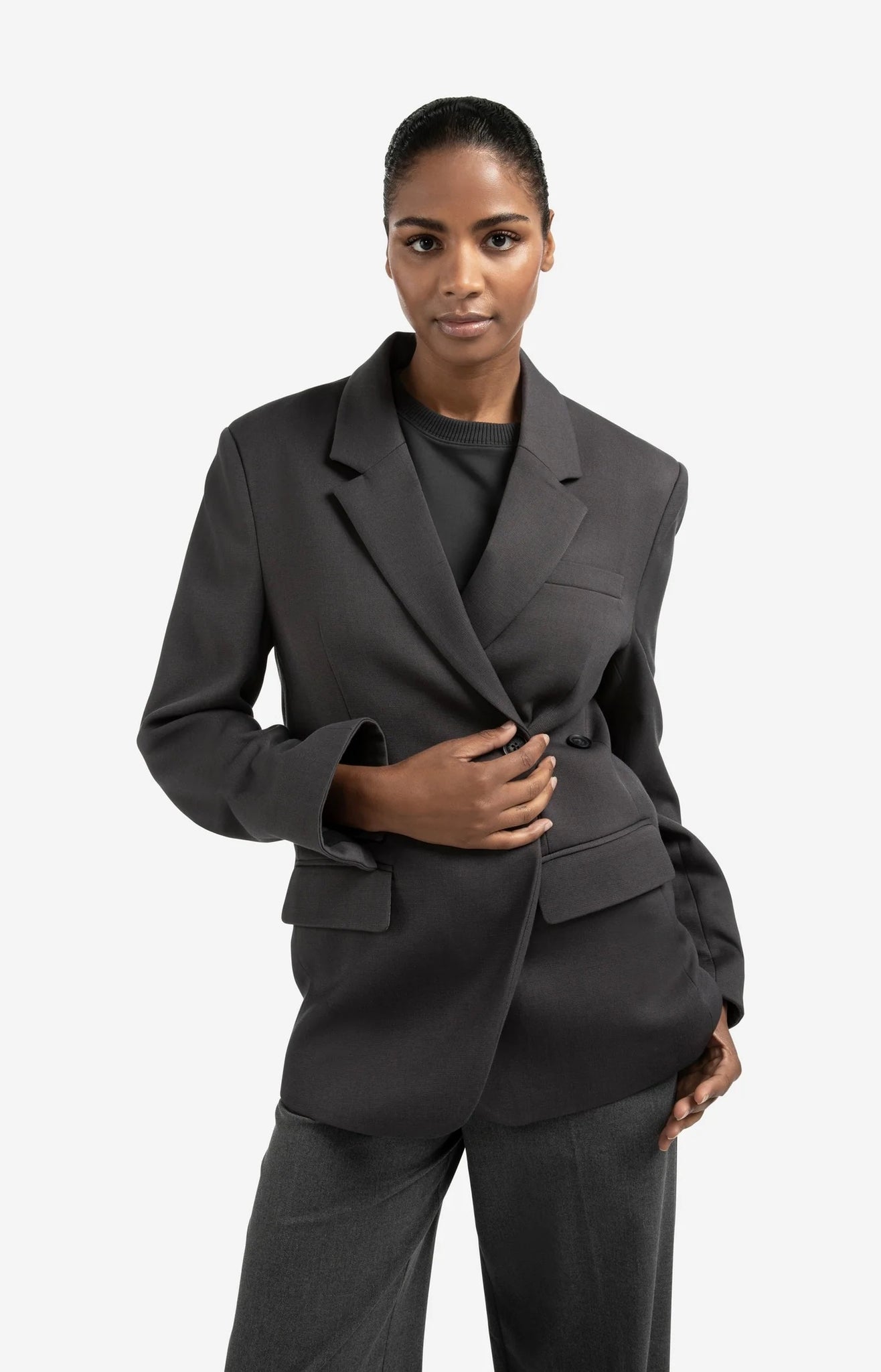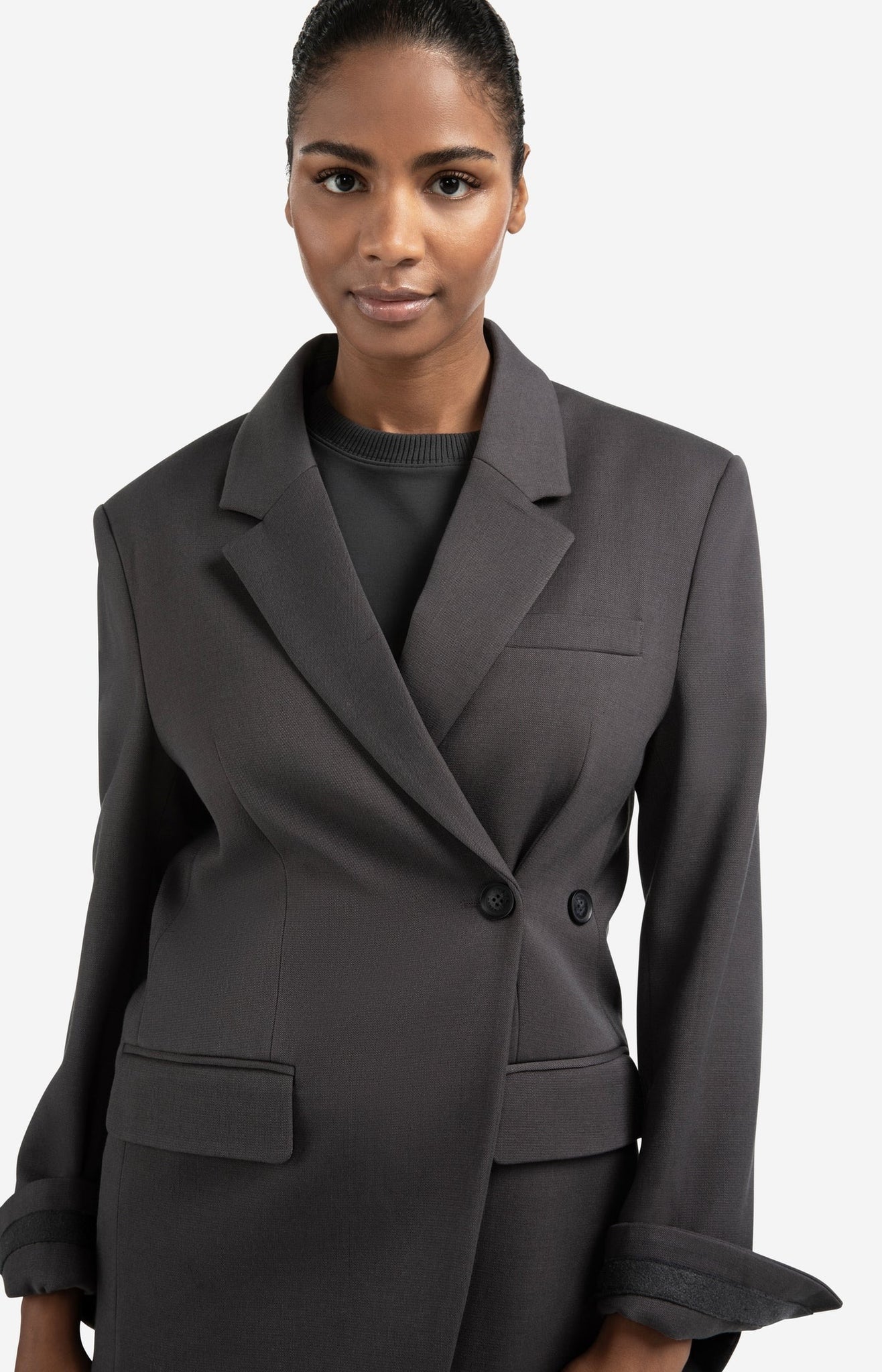 This oversized blazer is made of a woven fabric and features a classic lapel collar, double button closure and flap pockets. The sleeves are finished with a subtle decorative band for a sophisticated touch. The straight, oversized fit gives a modern look. Perfect for a stylish, casual or business look. The model is 176 cm and wears size 36.