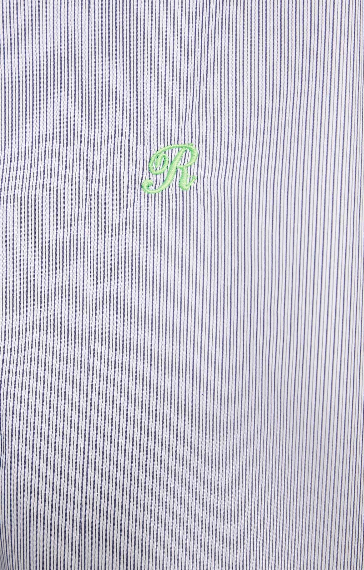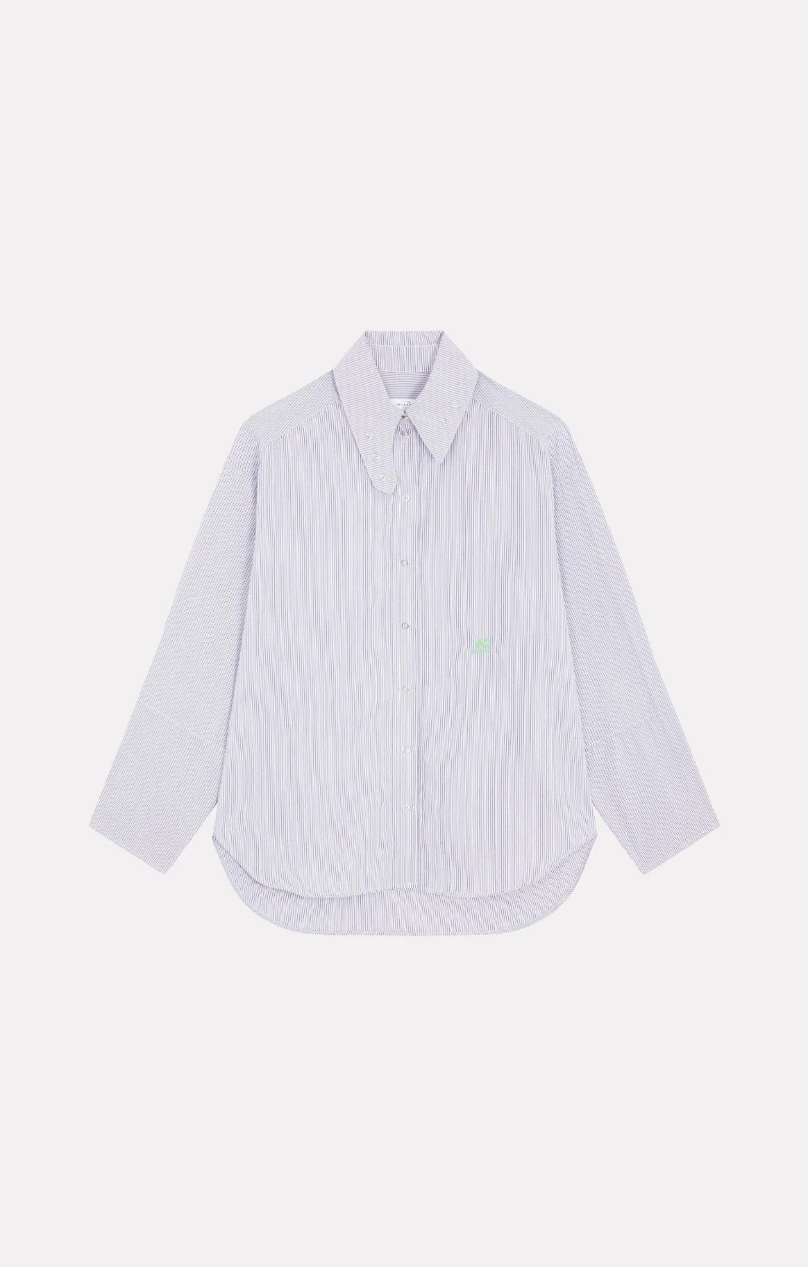 This straight and loose-cut shirt features a high collar with an integrated chin strap. It closes with metallic snap buttons and can be worn in multiple ways.
