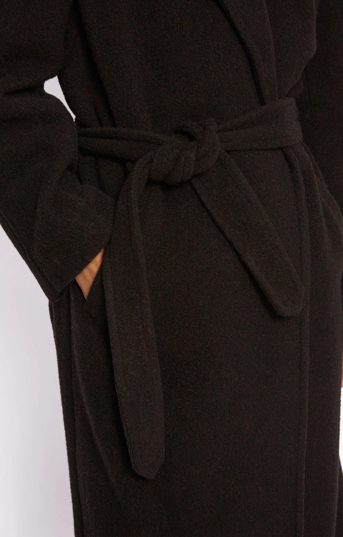 Long straight-cut wool coat with a double-breasted closure and a removable belt.
