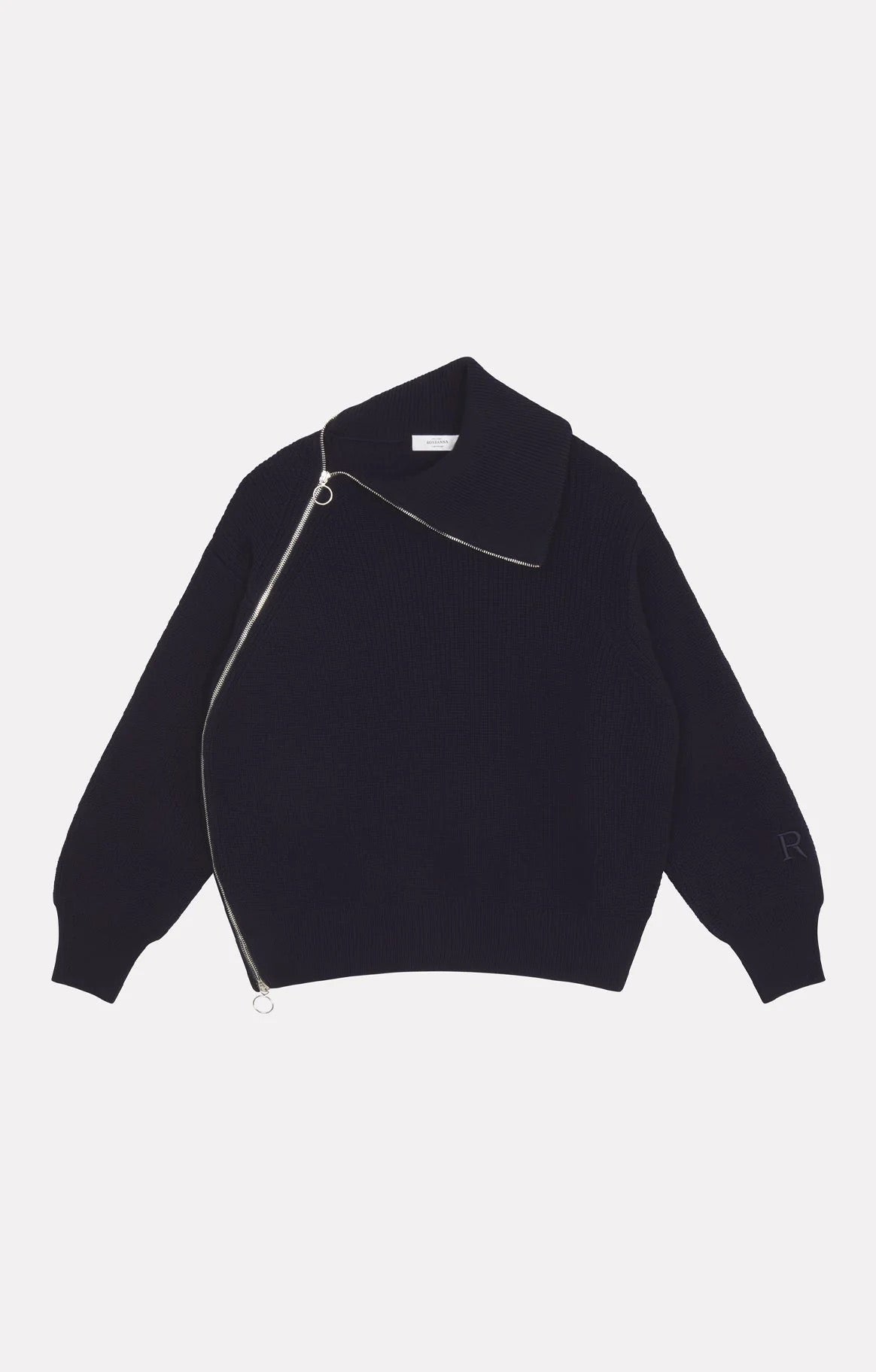 Asymmetric knit Roseanna sweater, ZIP model, Navy color.