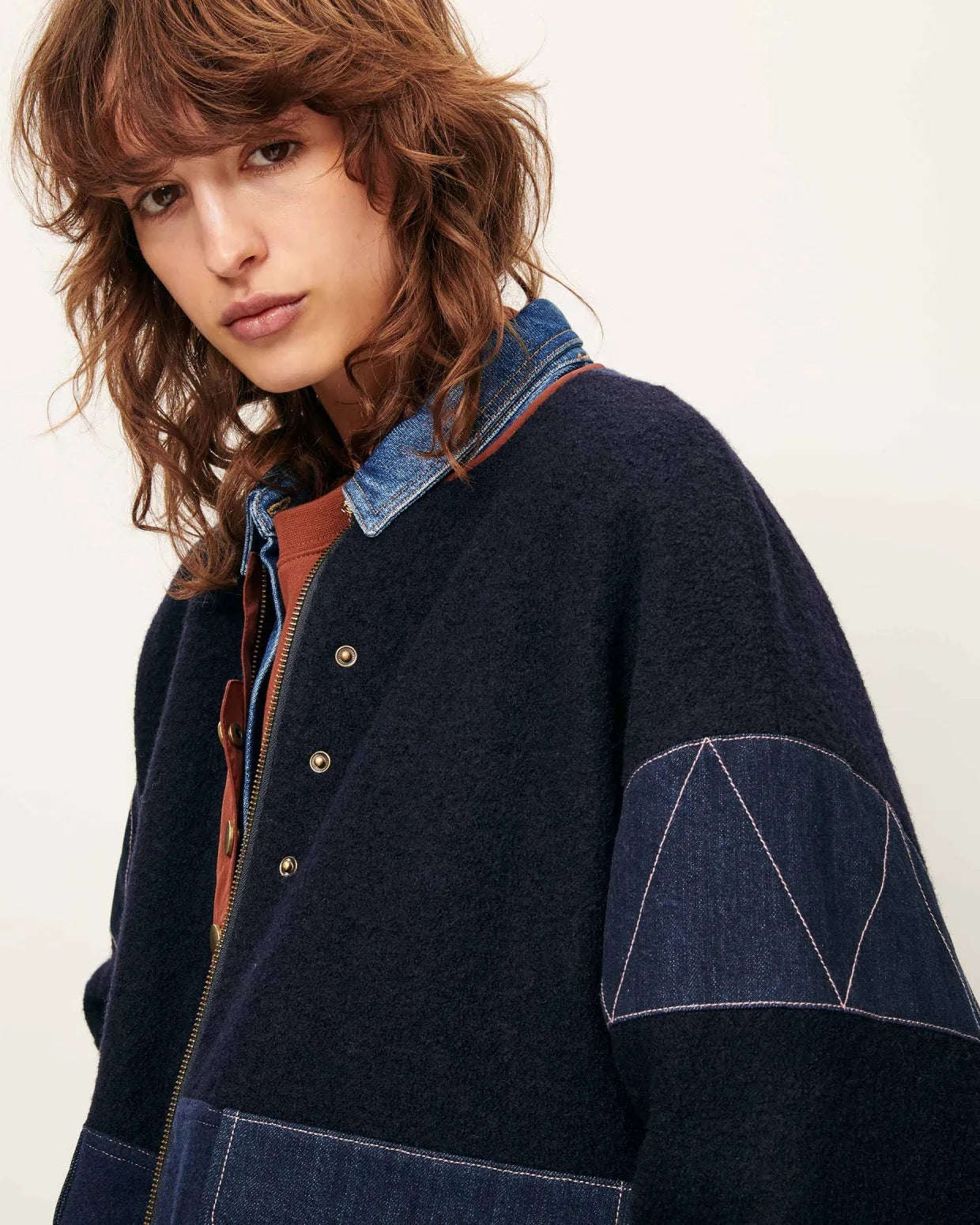 Jacket in boiled wool. Denim yokes and contrast topstitching. Snap tab detail and contrasting nylon trim.