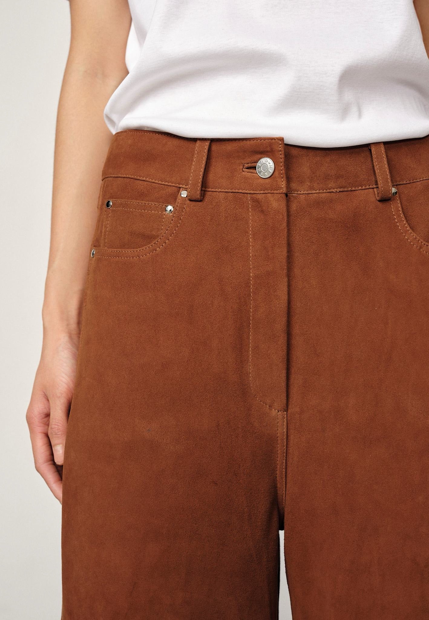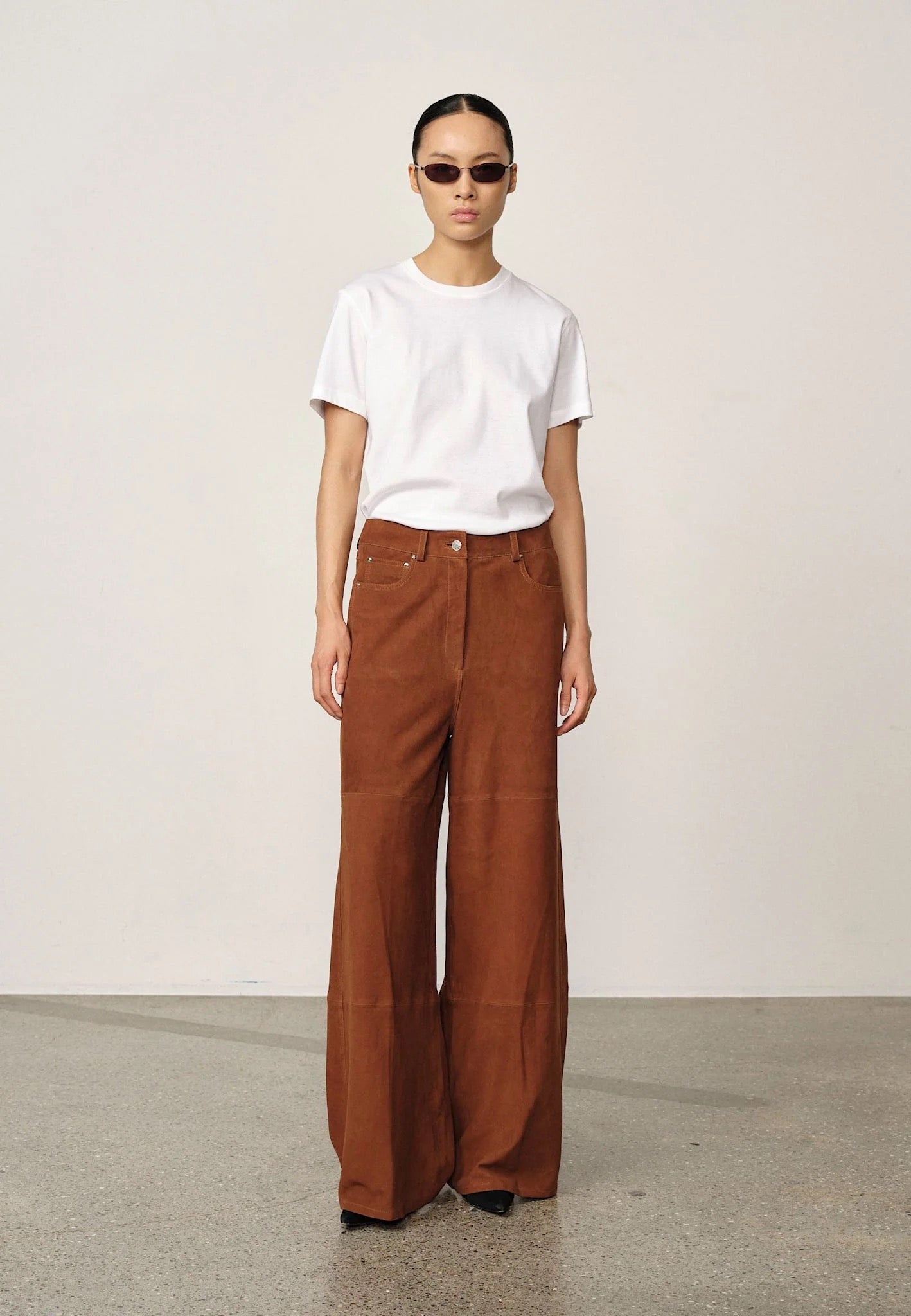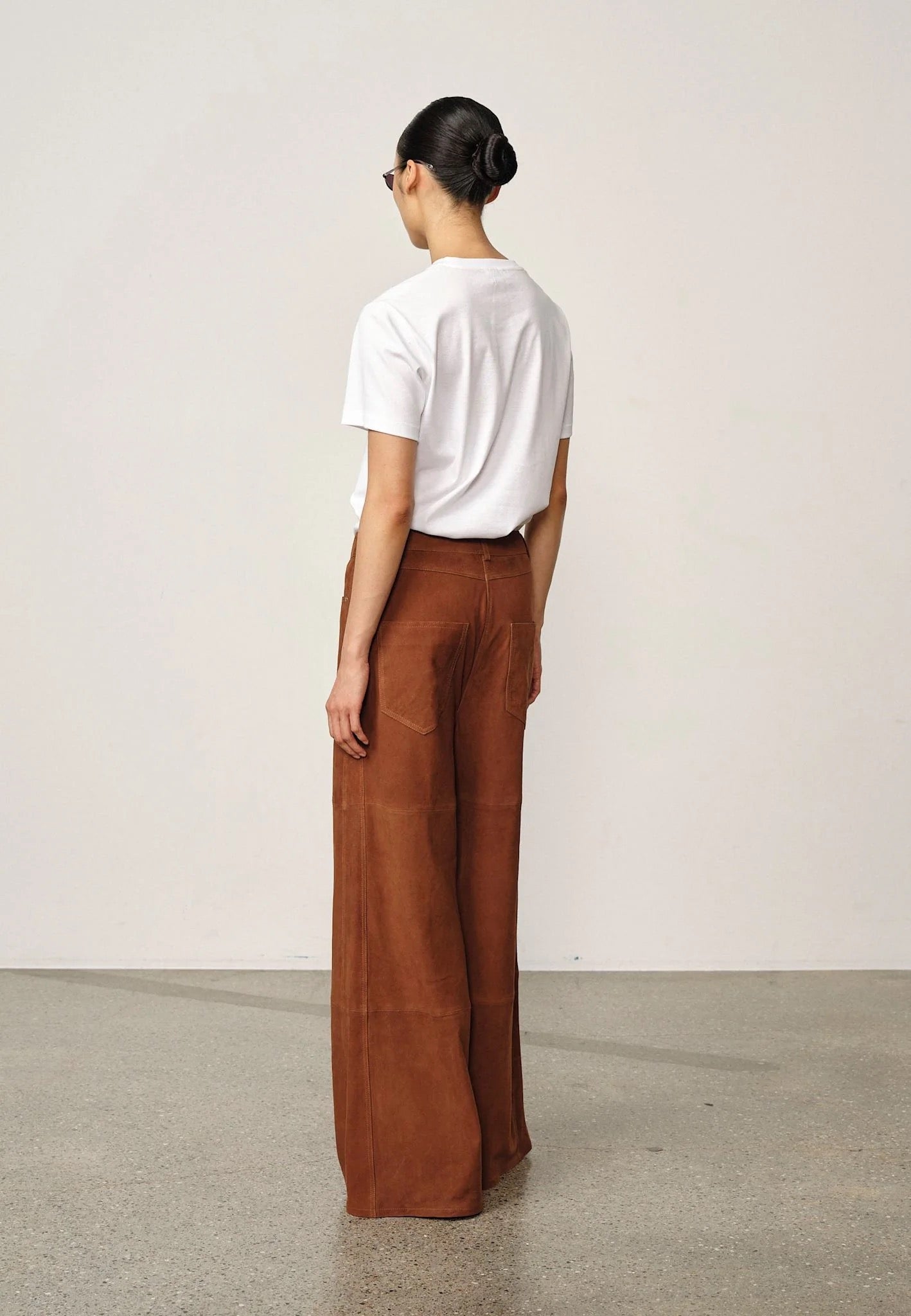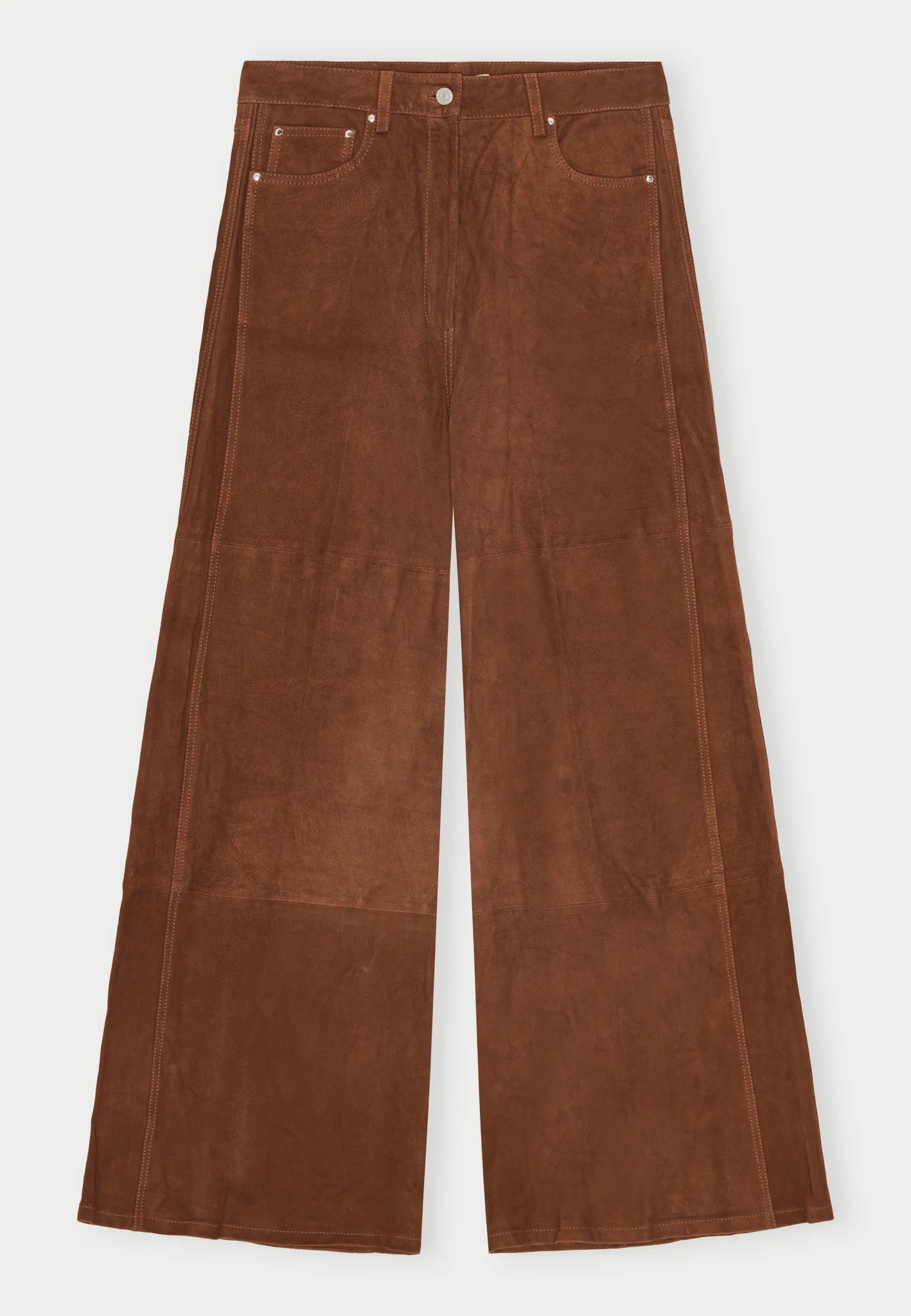 Introducing the Katja Suede Pants: A pair of pants designed with extra length and a wide legs. They feature an oversized fit and include detailing along the sides of the legs.